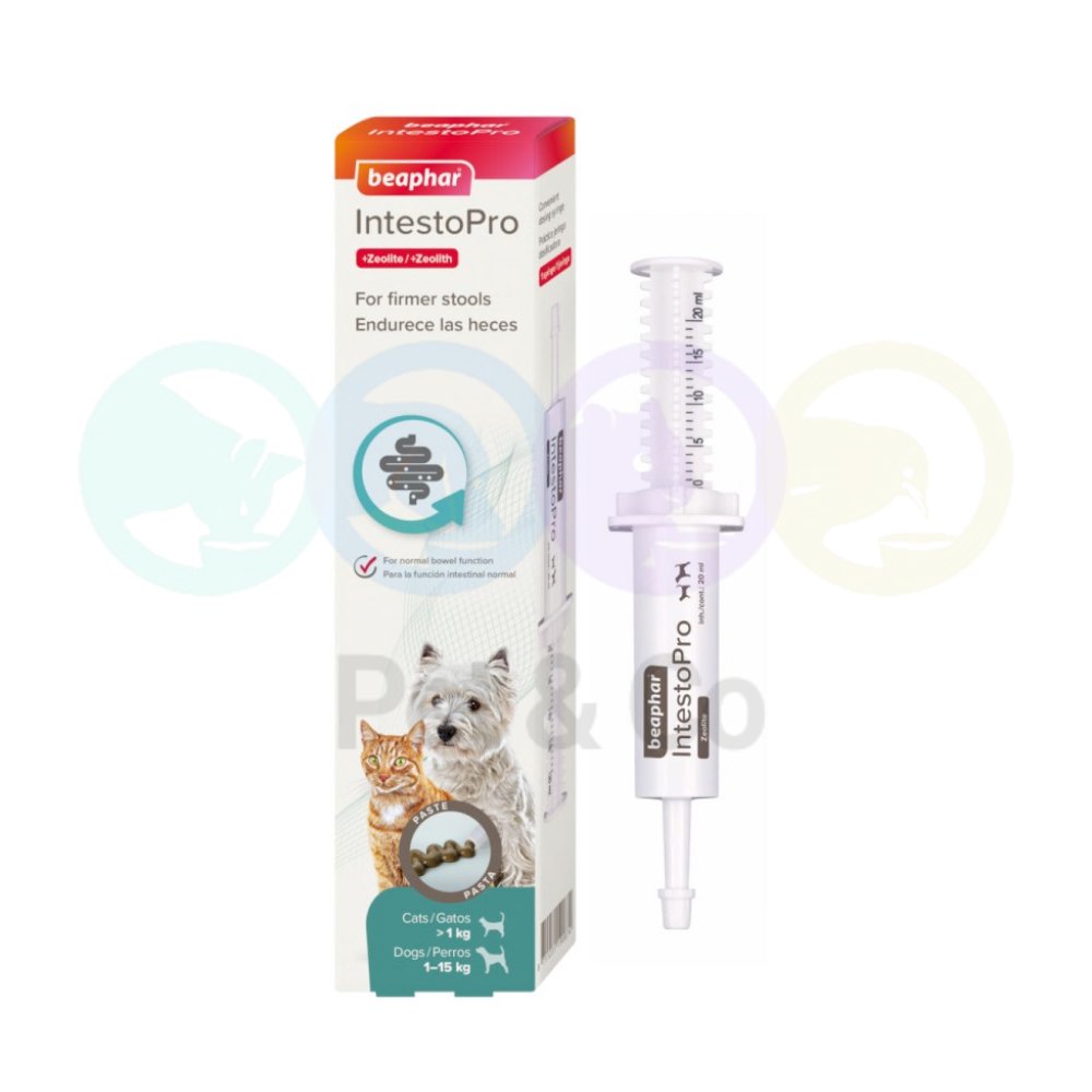 Beaphar IntestoPro paste cat/dog up to 15kg helps to relieve intestinal problems in dogs/cats from 4 weeks and 1kg weight. With zeolite: helps to make stools more solid. Suitable for changing, loose stools. In handy dosing syringe.