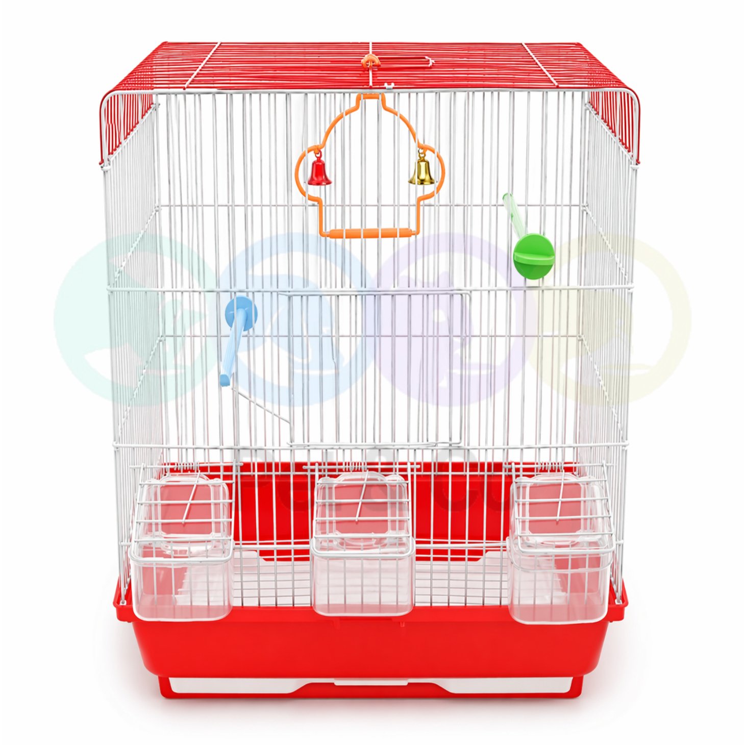 White cage frame with red/orange/green/blue base and colorful accessories