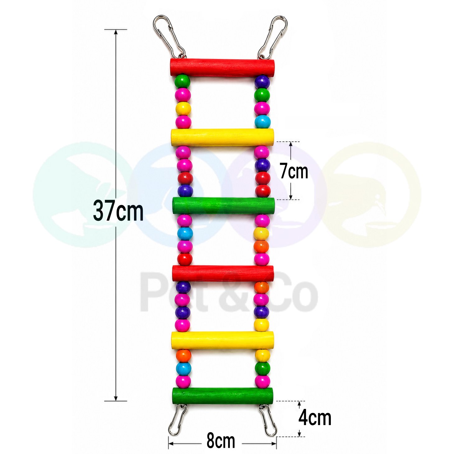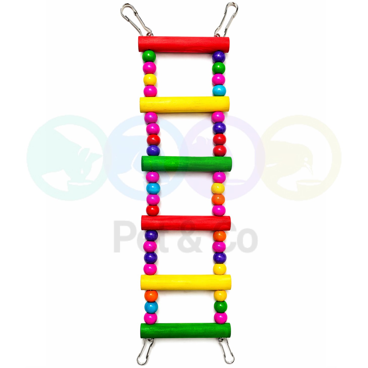 Made from bird-safe natural wood and brightly colored beads, the ladder provides multiple textured surfaces that birds love to explore. Strong metal hooks at both ends make it easy to attach securely inside most bird cages.