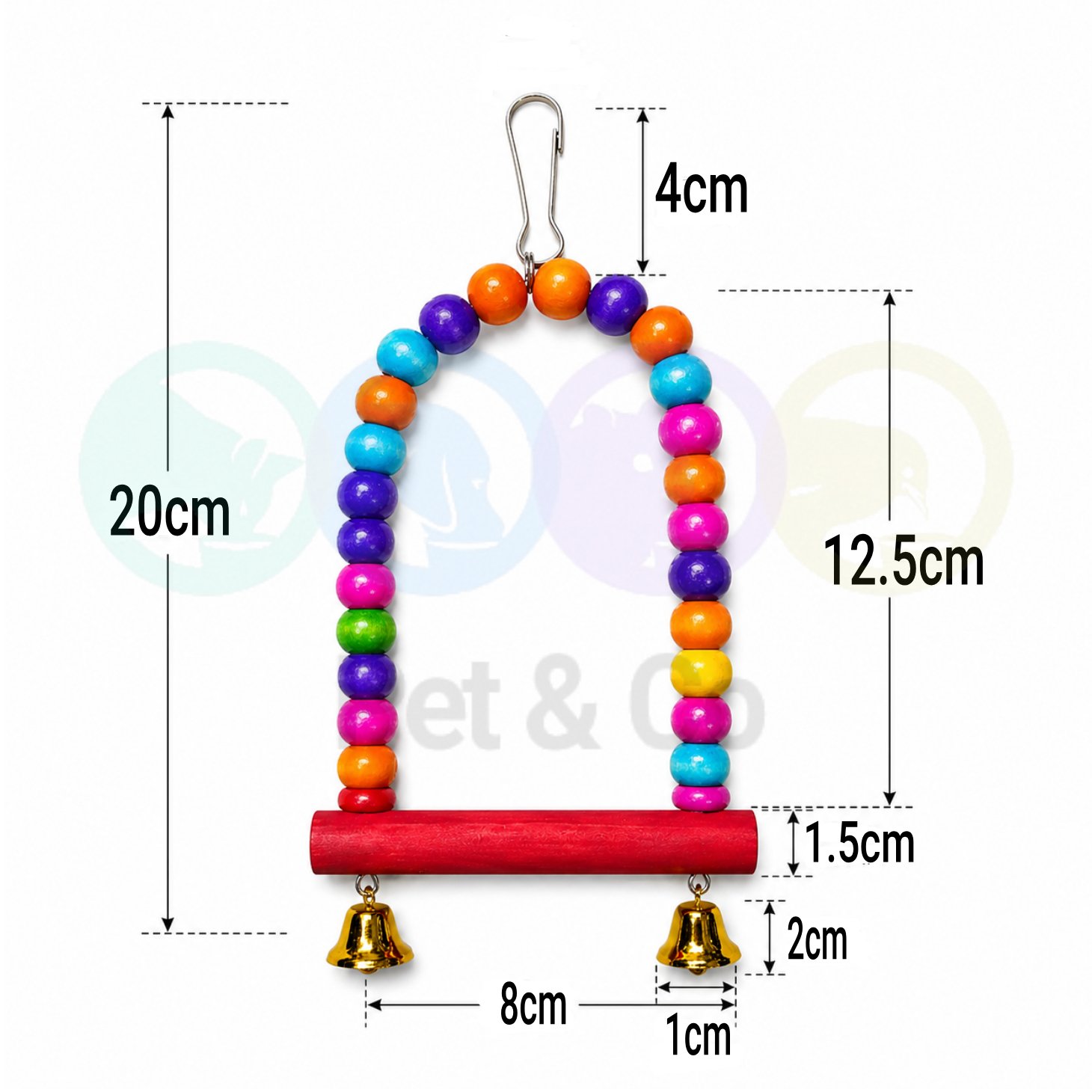 Colorful wooden bird swing perch toy designed for pet birds and small parrots. Features bright multicolor wooden beads arranged in an arch shape, a sturdy red wooden perch base, and two hanging metal bells for added sound stimulation and play. Includes a metal hook for easy attachment to bird cages.