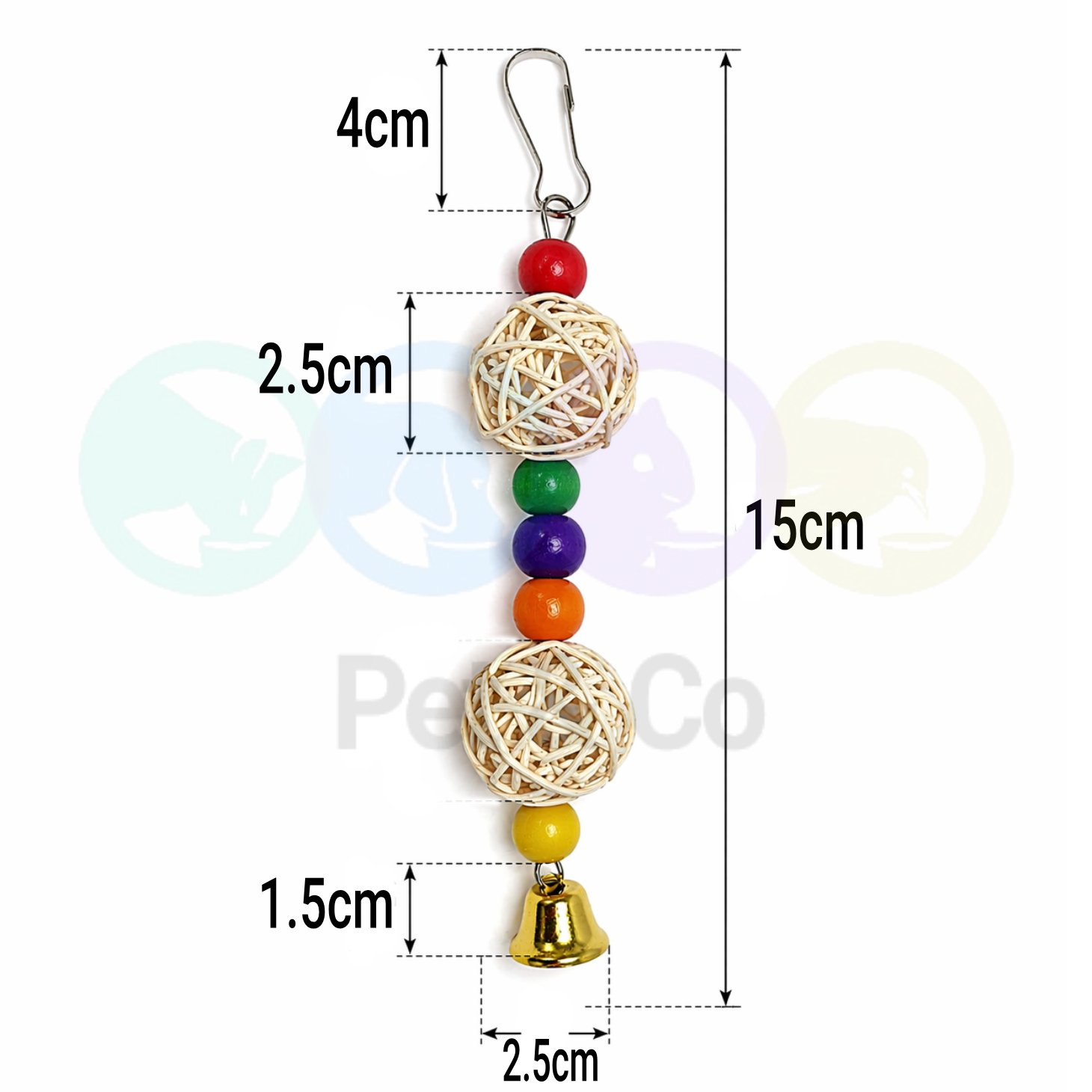 Keep your bird entertained and mentally stimulated with this charming hanging bird toy. Featuring two natural rattan chew balls, colorful wooden beads, and a fun jingling bell, this toy encourages pecking, chewing, climbing, and active play.