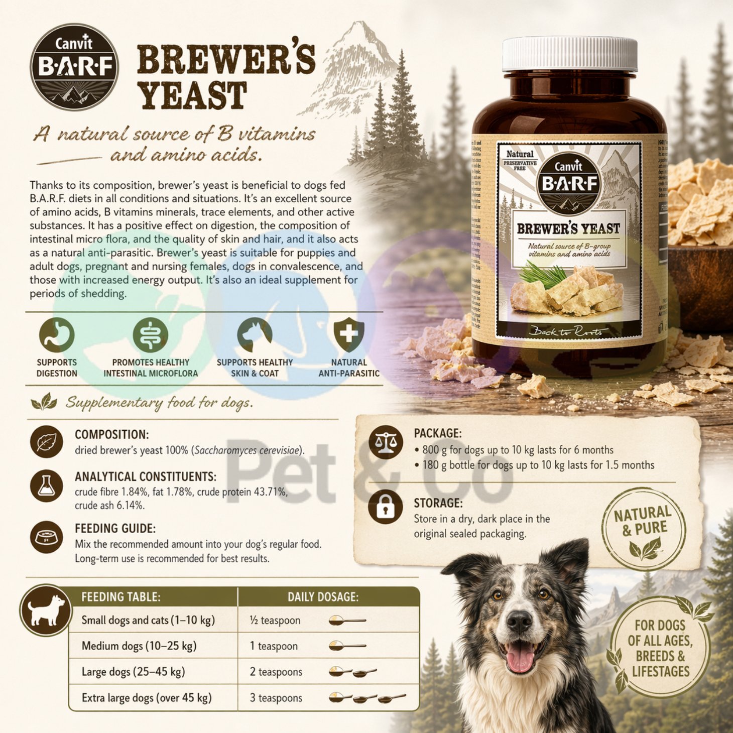 Thanks to its composition, brewer’s yeast is beneficial to dogs fed B.A.R.F. diets in all conditions and situations. It’s an excellent source of amino acids, B vitamins minerals, trace elements, and other active substances. It has a positive effect on digestion, the composition of intestinal micro flora, and the quality of skin and hair, and it also acts as a natural anti-parasitic. Brewer’s yeast is suitable for puppies and adult dogs, pregnant and nursing females, dogs in convalescence, and those with increased energy output. It’s also an ideal supplement for periods of shedding.