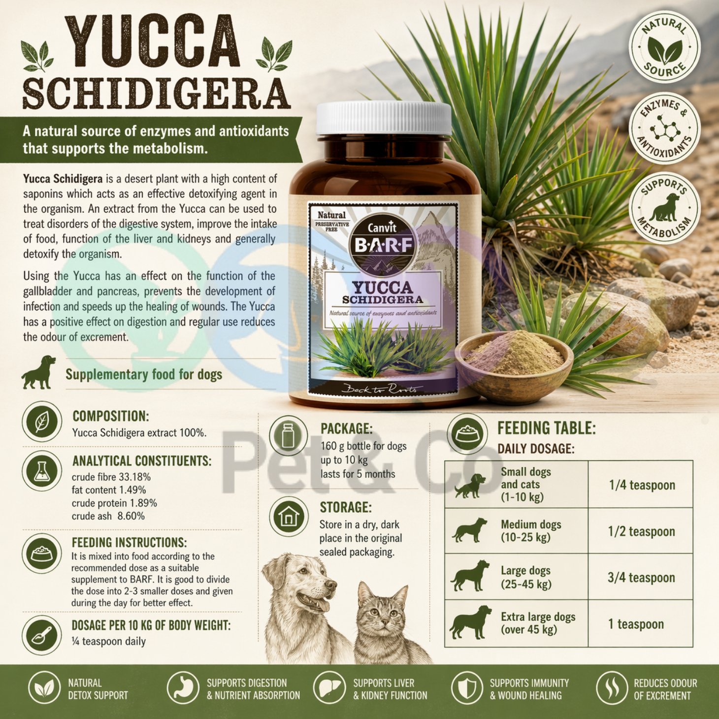 Yucca Schidigera is a desert plant with a high content of saponins which acts as an effective detoxifying agent in the organism. An extract from the Yucca can be used to treat disorders of the digestive system, improve the intake of food, function of the liver and kidneys and generally detoxify the organism.