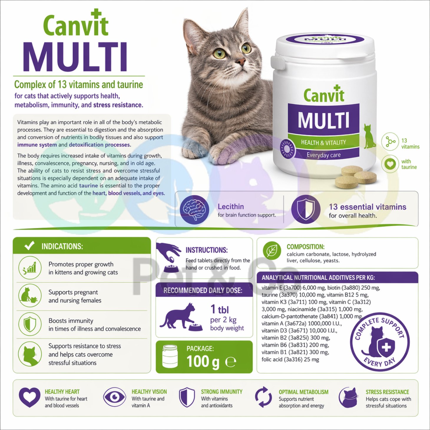 Complex of 13 vitamins and taurine for cats that actively supports health, metabolism, immunity, and stress resistance.