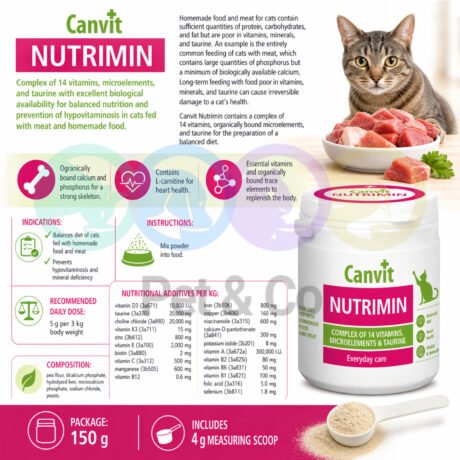 Vitamins play an important role in all of the body’s metabolic processes. They are essential to digestion and the absorption and conversion of nutrients in bodily tissues and also support immune system and detoxification processes. The body requires increased intake of vitamins during growth, illness, convalescence, pregnancy, nursing, and in old age. The ability of cats to resist stress and overcome stressful situations is especially dependent on an adequate intake of vitamins. The amino acid taurine is essential to the proper development and function of the heart, blood vessels, and eyes.