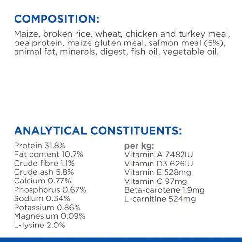 COMPOSITION: Maize, broken rice, wheat, chicken and turkey meal, pea protein, maize gluten meal, salmon meal (5%), animal fat, minerals, digest, fish oil, vegetable oil.