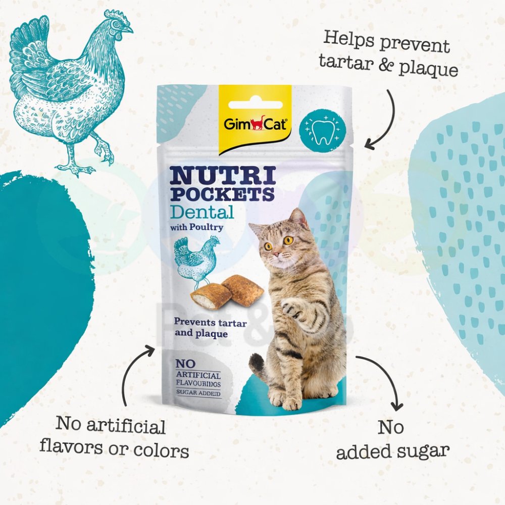 GimCat Nutri Pockets are crispy snacks with a delicious creamy filling, available in different super delicious flavours. A real treat for your four-legged friend! The Dental with Poultry variant, thanks to cleaning particles made of cellulose, supports the mechanical abrasion of the plaque helping to reduce its new formation. It contains vitamins and taurine, and is also without added sugar, artificial flavourings and colourings.