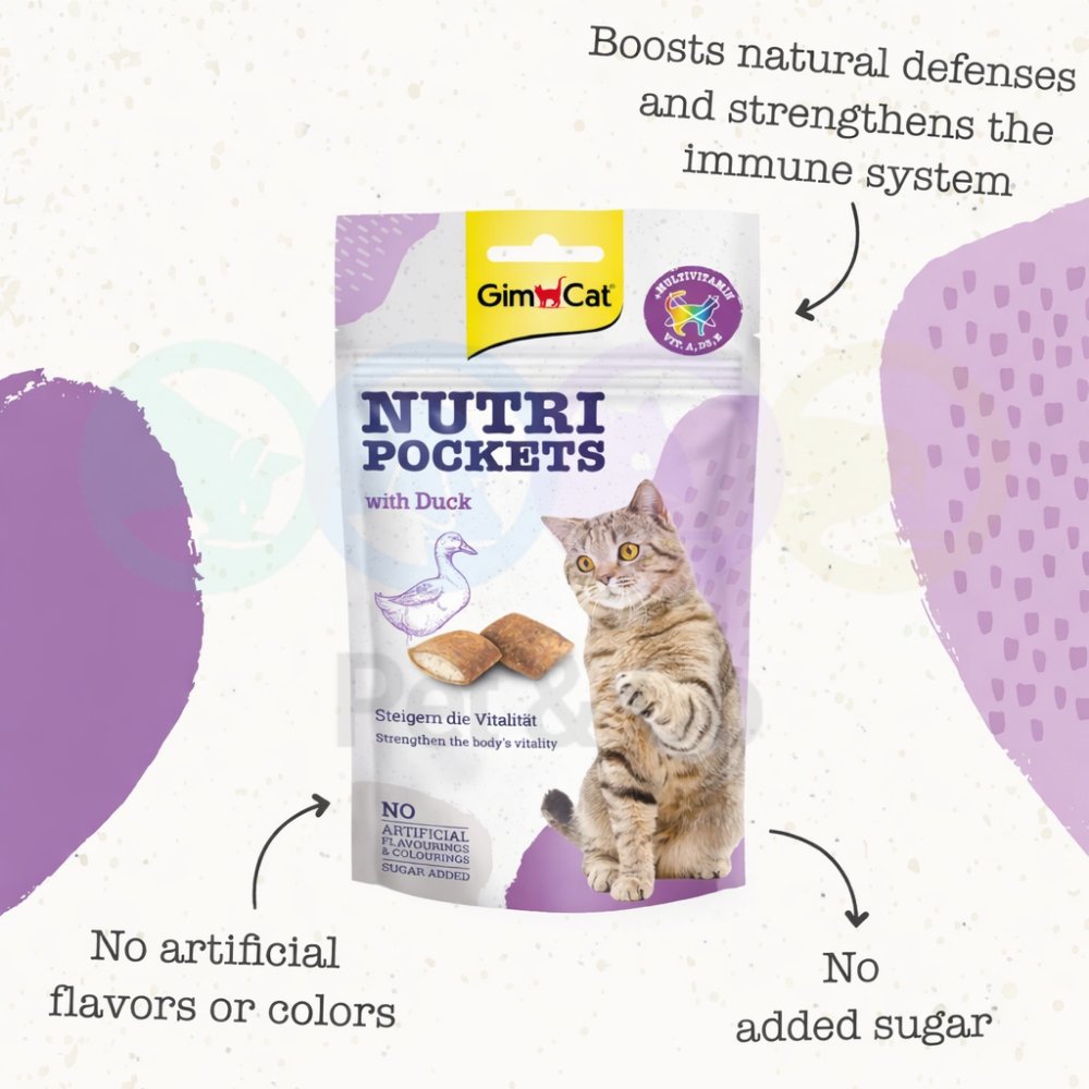 GimCat Nutri Pockets are crispy snacks with a delicious creamy filling, available in different super delicious flavours. A real treat for your four-legged friend! The variant with Duck activates the body’s own defences and support vitality. It contains vitamins and taurine, and is also without added sugar, artificial flavourings and colourings.