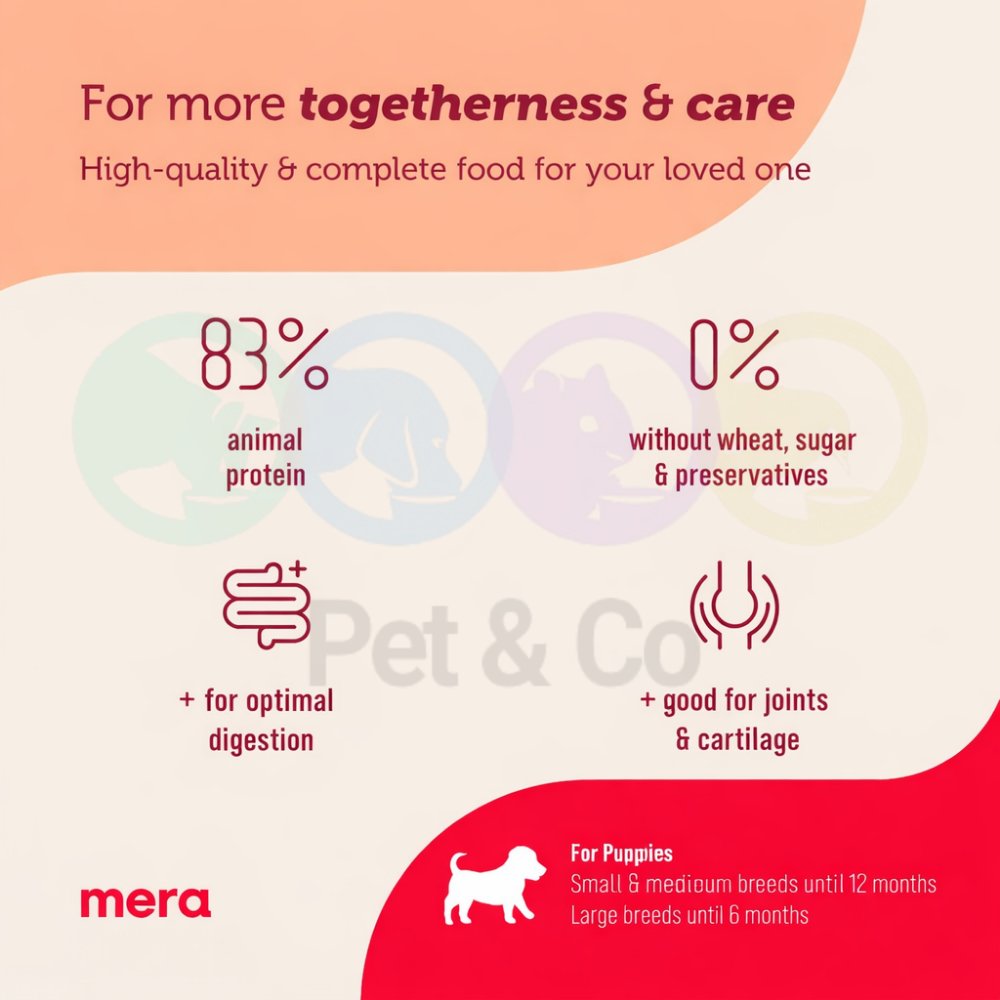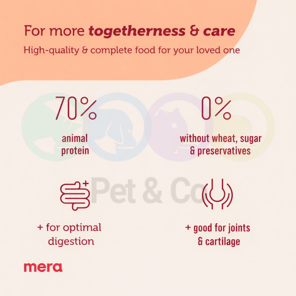 For joints and cartilage Glucosamine and chondroitin sulfate are components of articular cartilage and can support the strengthening of joints. 70 Percent animal protein Our product has a high meat content and a proportion of 70 Percent animal protein in the total protein content Without wheat, sugar and preservatives The dog only gets what he needs For optimal digestion Prebiotic inulin contributes to healthy intestinal flora and ensures optimal digestion Healthy skin & shiny coat thanks to the omega-3 and omega-6 fatty acids contained in salmon oil, linseed and sunflower oil