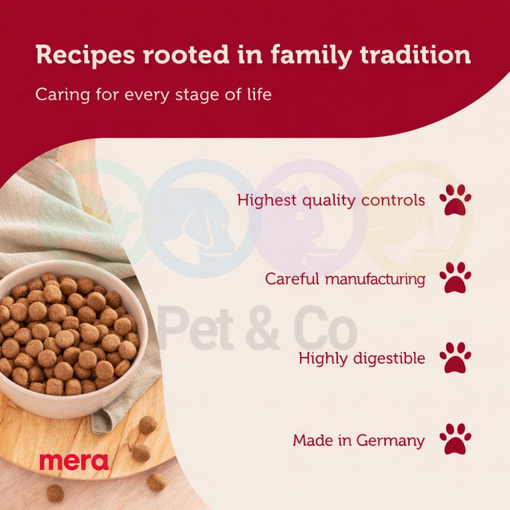 mera essential is a high-quality dog food line based on family recipes with a long tradition. This food connects generations and offers numerous unique selling points. One outstanding feature is the promotion of healthy skin and a shiny coat through an optimal ratio of omega-3 and omega-6 fatty acids. In addition, the products support the dog’s intestinal flora, which contributes to improved digestion.