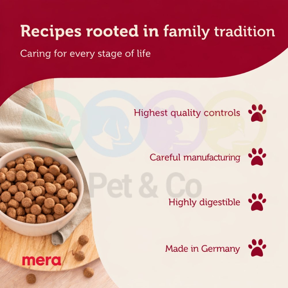 mera essential is a high-quality dog food line based on family recipes with a long tradition. This food connects generations and offers many unique selling points. One outstanding feature is the promotion of healthy skin and a shiny coat through an optimal ratio of omega-3 and omega-6 fatty acids. In addition, the products support the dog’s intestinal flora, which contributes to improved digestion.