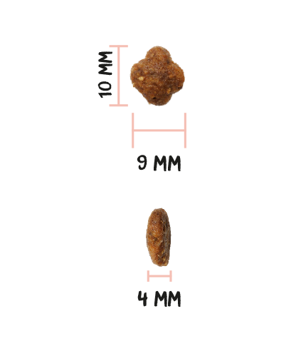 Fresh chicken* (15 % min. before cooking), fresh turkey* (15 % min. before cooking), wheat* (10 %), dehydrated chicken (10 %), poultry fat (preserved with natural antioxidants), salmon hydrolysate (8 %), rice* (8 %), cassava roots* (5 %), maize protein, dehydrated pork (4 %), wheat protein, fresh vegetables and fruits before cooking (apple* 1 %, carrot* 0.5 %, broccoli* 0.5 %), brewer’s yeast* (2 %), hydrolysed chicken protein, lignocellulose, salmon oil (preserved with natural antioxidants), dried egg* (1 %), beet pulp, rock salt*, dehydrated alfalfa*, chicory roots (FOS)*, yeast extract (MOS), dehydrated marine algae* (500 mg/kg), glucosamine (500 mg/kg), yucca shidigera, chondroitin sulfate (100 mg/kg), cranberries* (100 mg/kg), green tea* (80 mg/kg), echinacea* (80 mg/kg), camomile flower* (80 mg/kg), fennel* (80 mg/kg). *Natural ingredients