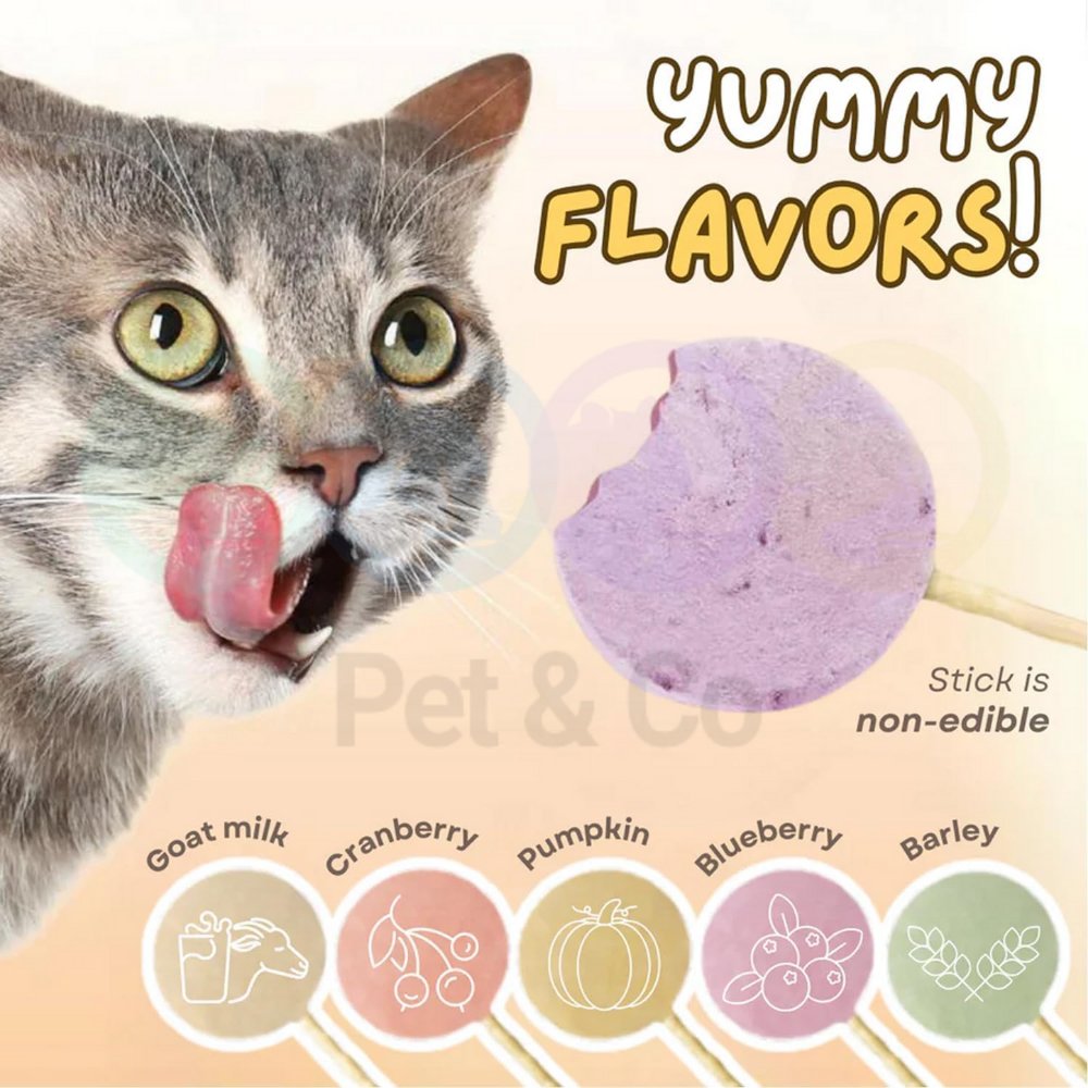 - Mix of Flavours: Includes five delicious options: goat milk, pumpkin, blueberry, cranberry, and barley grass. Each pack contains five lollipops, one of each flavour, to give your cat a variety of tastes to enjoy.