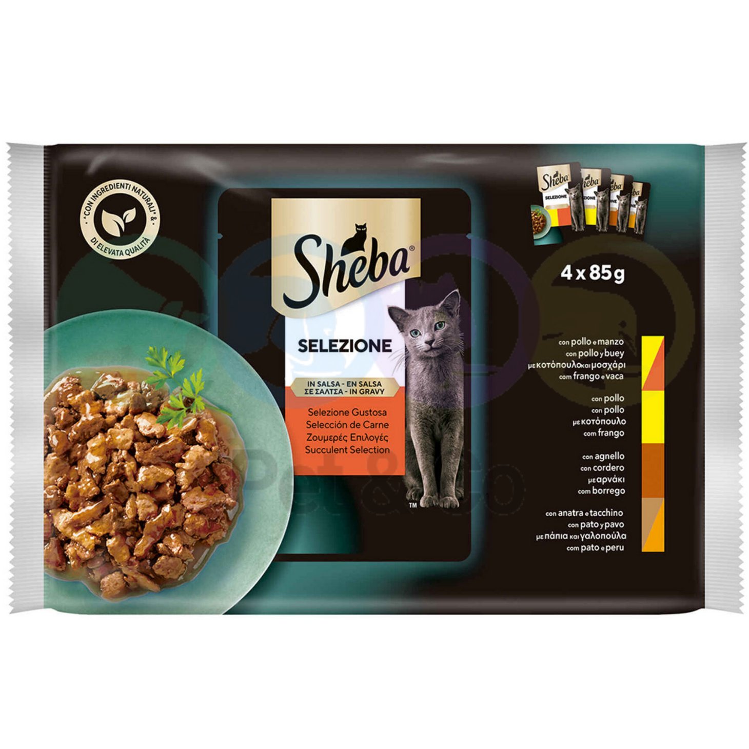 Sheba Pouches Select Slices in Gravy offers a variety of wonderful recipes, with innovative tastes that will please every palate. Each balanced, flavoursome meal is made without the use of artificial flavours or preservatives and is ideal for adult cats. The practical pouches keep food fresh and make it exceptionally easy to serve your cat’s meals. Whether your cat prefers beef, lamb, turkey, chicken or fish, there is something for everyone with Sheba Selection in Gravy! Keep your cat on its toes and bring balanced variety to its diet with these mouth-watering wet food pouches. A different flavour every day!